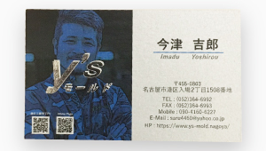 代表の今津さんの名刺を制作しました。 顔写真をy’sモールドさんのロゴの色にもなっている青で加工し、左半分に大胆に配置しました。きらきらとした紙質とロゴの銀箔で高級感とインパクトを演出しています。